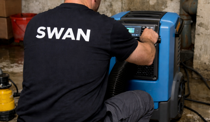 SWAN ofron shërbim profesional për dhënien me qira të tharëseve industriale (affugter) për tharjen efektive dhe të sigurt të hapësirave të prekura nga uji.